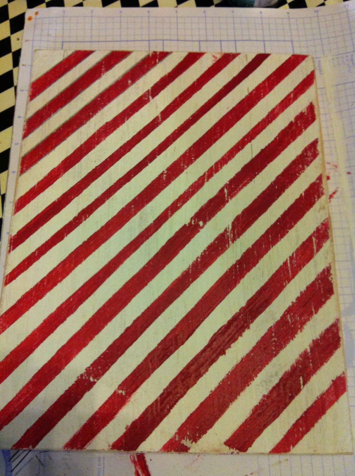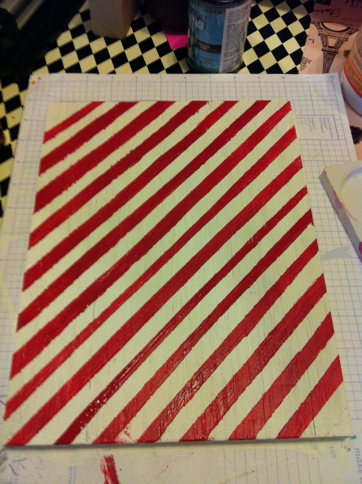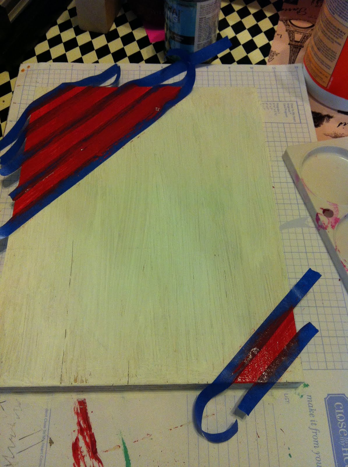 Started with a white base coat- just acrylic paint. Then cut and taped off diagonal lines. Painted with my little handy Benjamin Moore samples- this one is burnt peanut red.