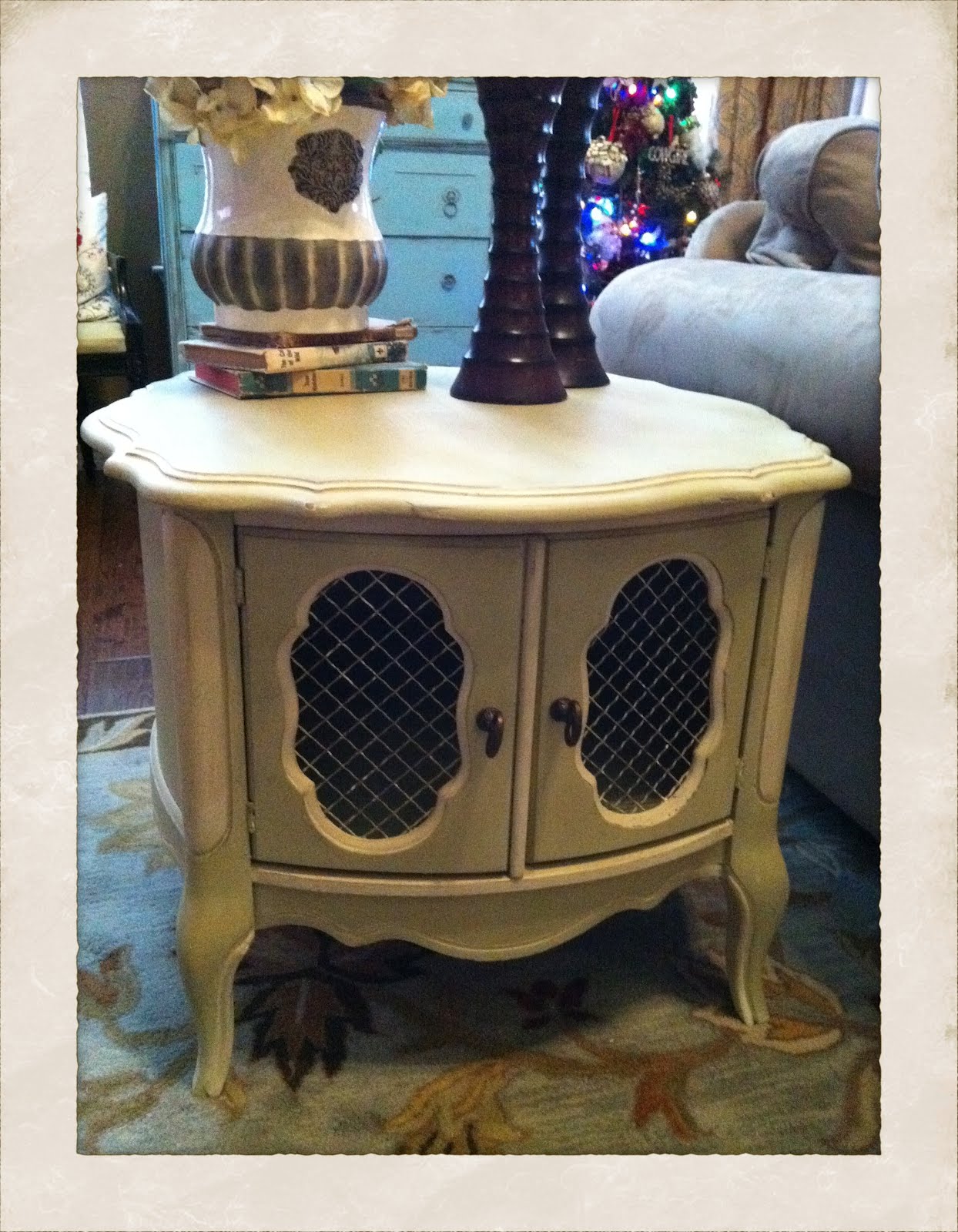 I also have this beautiful little end table/ nightstand that is so French and so chic!! Redid her in ASCP Versailles and Old Ochre accents. She is For Sale also but she is one of Mia’s favorite little pieces to play with. She just sits there opening the door as though something unexpected will be in there each time she opens it… surprisingly she hasn’t hid anything in it yet!! I did replace the hardware as the original was missing. And the wire is in perfect condition on the doors!! It is just so perfect!!